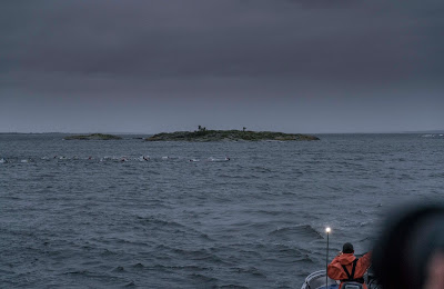 Hardened GSP-skipper Fabian steered us around all kinds of trouble as we efficiently voyaged on the right side of the searing horde. The first swim went without any difficulties and we were confronted with the slippery rocks on Vindalsö. We took it very easy. After some changeovers we saw that Thomas Schreven crashed pretty seriously. Shortly after his wife Jasmina ran towards us we witnessed him lying lifeless on his back. Later on we learned that he was OK but at that time it was an eye opener and a very distressing sign. Notwithstanding our cautious tactic on the technical stone parts we found our rhythm fast.