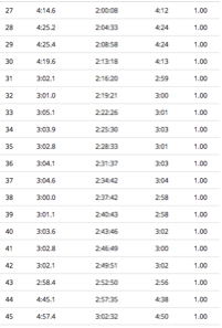 There was also a session that I helped my training partner Mitch Brown out with as he helped me out with my 3x6km session. I reckon this session had some big benefits and put me in good stead for Berlin. His session was 7km, 6km, 5km, 4km, 3km, 2km, 1km as a continuous run off 1km jog/float recoveries. We also used this session as an opportunity to practice our fluid and gel intake. Times are below: